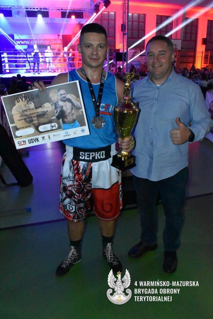 – Pomimo dwukrotnego liczenia, wygrał walkę przez poddanie. Po kolejnej celnej kombinacji nie pozostało nic innego jak odebrać zasłużony puchar dowódcy 15 Gołdapskiego Pułku Przeciwlotniczego – relacjonuje trener ppłk rez. Piotr Luczek. – Dziękuję dyrektorowi Szkoły Podstawowej nr 4 w Giżycku Bartoszowi Orczyc – Musiałkowi za wsparcie i udostępnianie sali sportowej w szkole do treningów.
