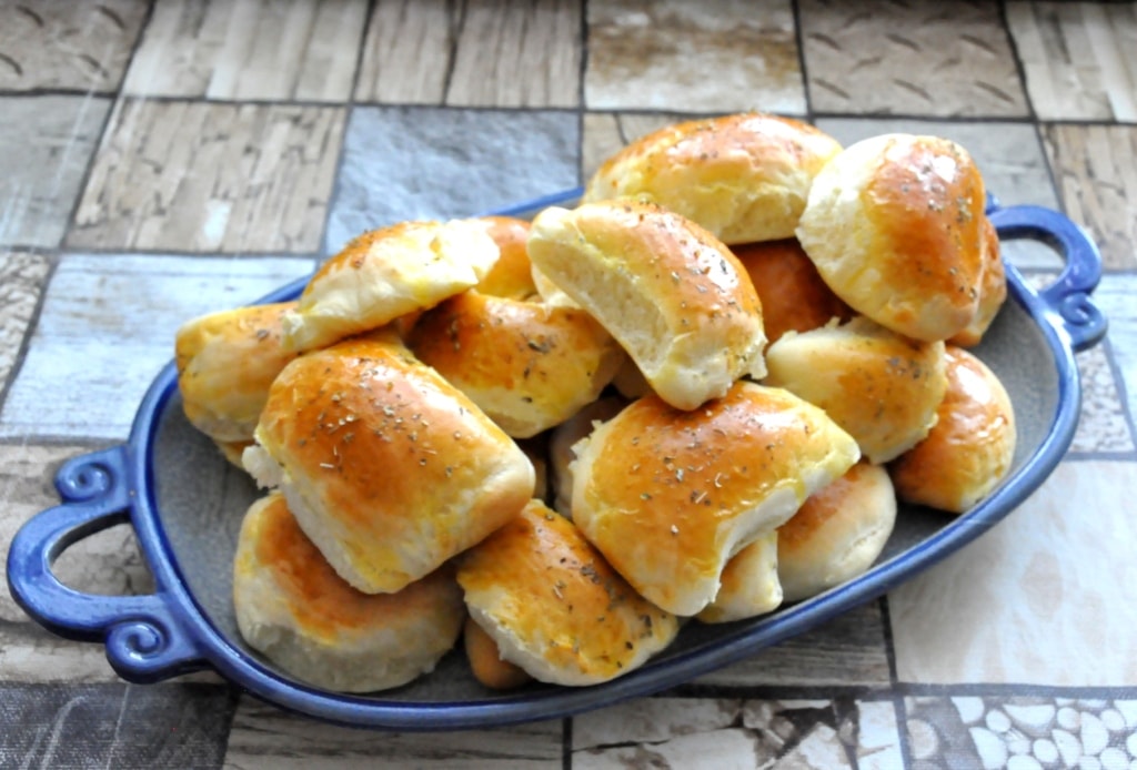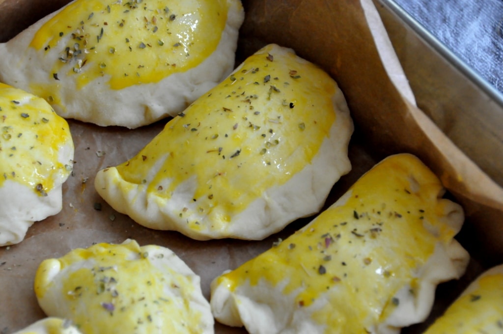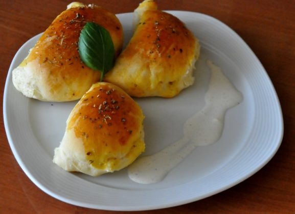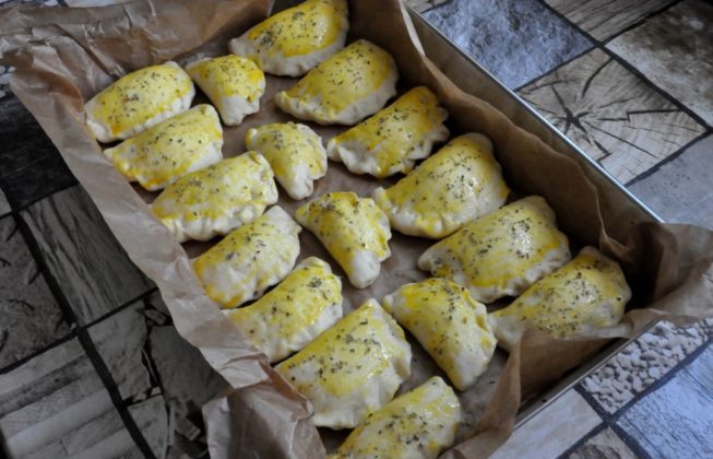 Wyrośnięte ciasto przełożyć na stolnicę i podzielić na dwie części. Rozwałkować, wycinać filiżanką krażki ciasta, nakładać farsz i lepić jak klasyczne pierogi. Układać na blaszce, smarować roztrzepanym żółtkiem, można posypać ulubionymi ziołami. Piec ok. 30-35 min w temp. 180 stopni.