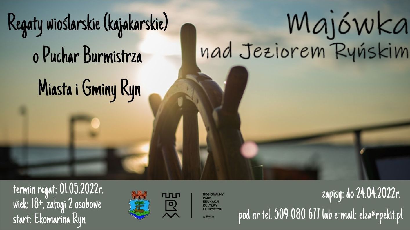 Regionalny Park Edukacji, Kultury i Turystyki w Rynie zaprasza do zapisów i udziału w Regatach wioślarskich (kajakarskich) o Puchar Burmistrza Miasta i Gminy Ryn, które odbędą się w trakcie Majówki nad jez. Ryńskim.