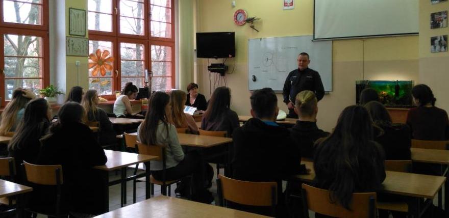 Policjant Referatu Ruchu Drogowego z Komendy Powiatowej Policji w Giżycku spotkał się z uczniami I Liceum Ogólnokształcącego im. Wojciecha Kętrzyńskiego w Giżycku W trakcie spotkania funkcjonariusz rozmawiał przede wszystkim o bezpieczeństwie w ruchu drogowym w tym kierowaniu pod wpływem alkoholu i środków odurzających.