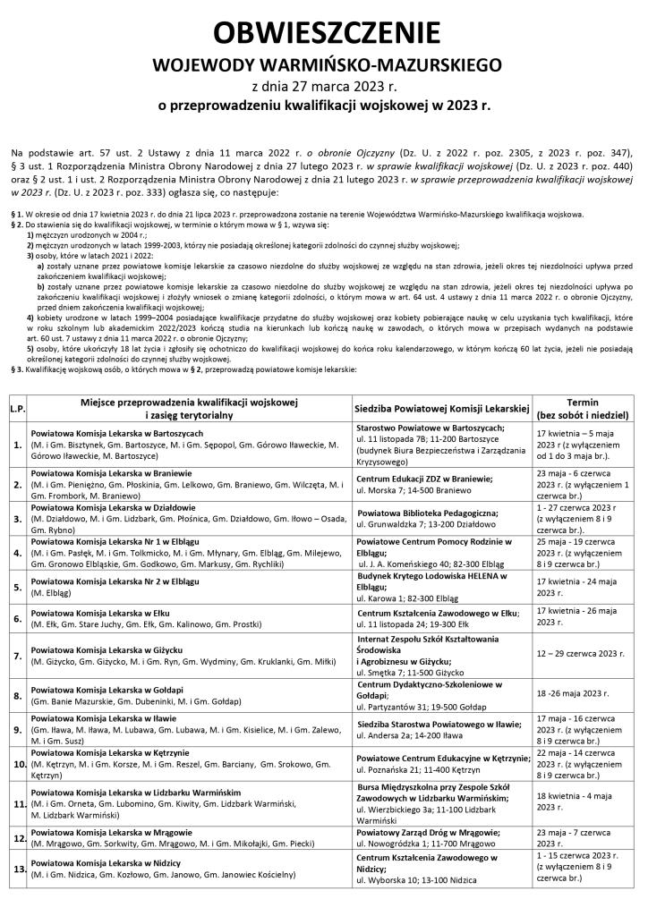 Obwieszczenie Wojewody Warmińsko-Mazurskiego z dnia 27 marca 2023 r. o przeprowadzeniu kwalifikacji wojskowej w 2023 r.