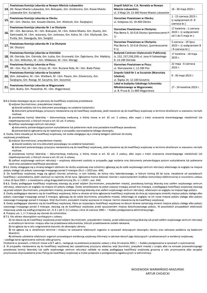 Do stawienia się do kwalifikacji wojskowej, w terminie o którym mowa w § 1 Obwieszczenia Wojewody Warmińsko-Mazurskiego, wzywa się: