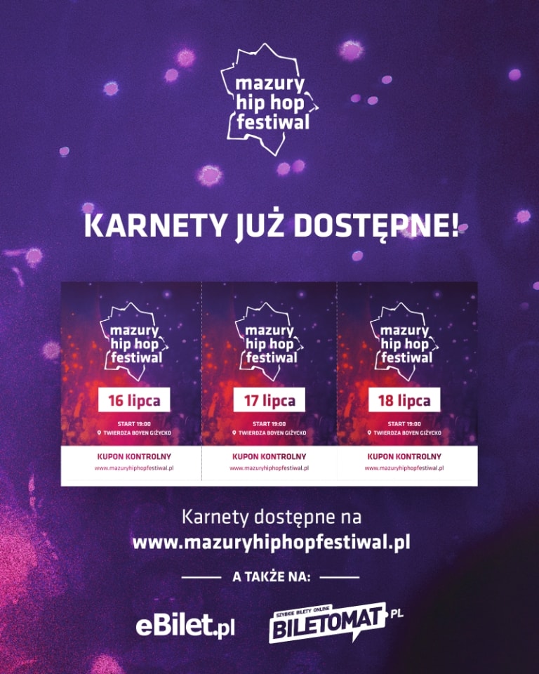 Organizatorzy najstarszego i najważniejszego festiwalu w kraju Mazury Hip Hop Festiwalu odpalili pierwszą pulę karnetów! Termin tegorocznej 19 edycji wydarzenia to 16-18 lipca 2020r.
