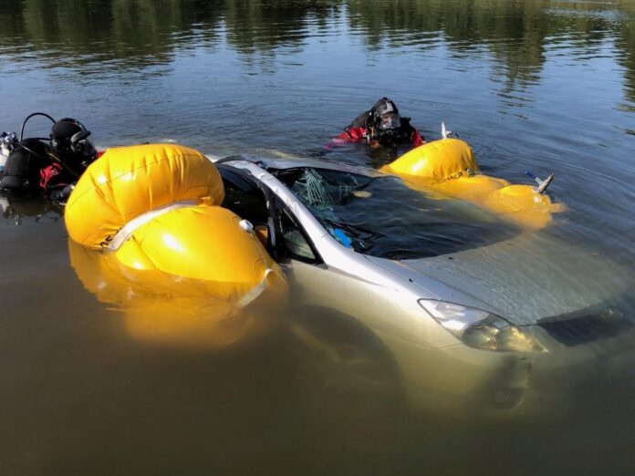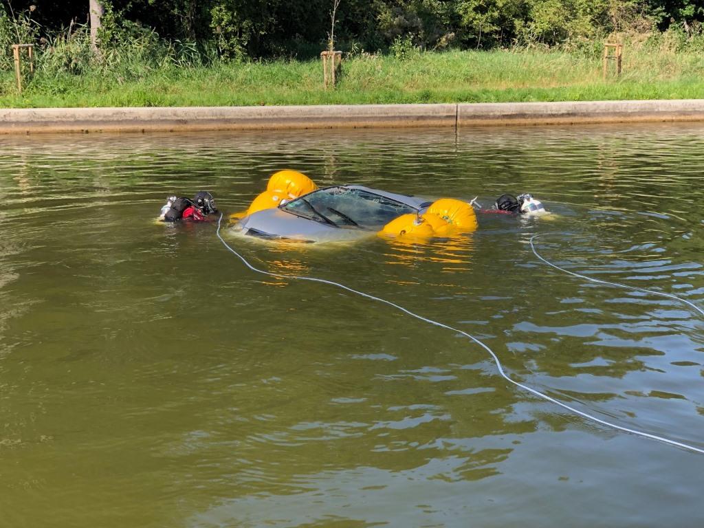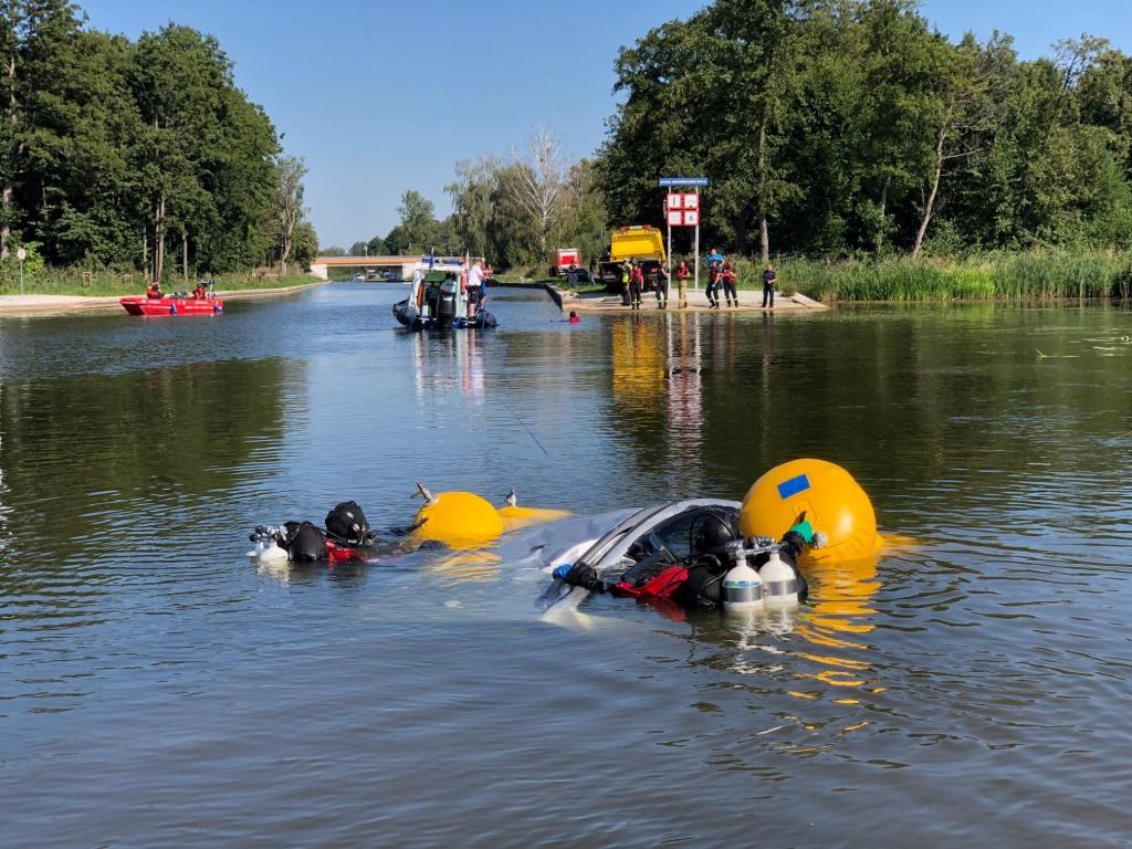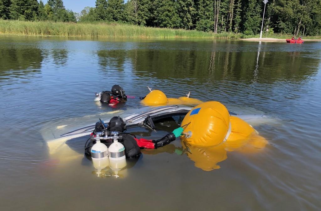 – Po dotarciu na miejsce stwierdzono, że przepływający przez kanał hauseboat zahaczył śrubą napędową o samochód znajdujący się na dnie. Nasze działania polegały na przeprowadzeniu inspekcji obiektu znajdującego się pod wodą, zbudowaniu stanowiska i systemu do uniesienia pojazdu na powierzchnię wody przy pomocy balonów wypornościowych (idrodyn). Następnie auto zostało przeholowane po powierzchni wody do niskiego brzegu celem wyciągnięcia go z wody przy pomocy wyciągarek samochodowych. Ponieważ samochód został częściowo zdeformowany przez śrubę napędową przepływającej łodzi, do otwarcia drzwi użyto sprzętu hydraulicznego. Wewnątrz pojazdu znajdowało się ciało mężczyzny – relacjonują strażacy z Komendy Powiatowej Państwowej Straży Pożarnej w Giżycku.