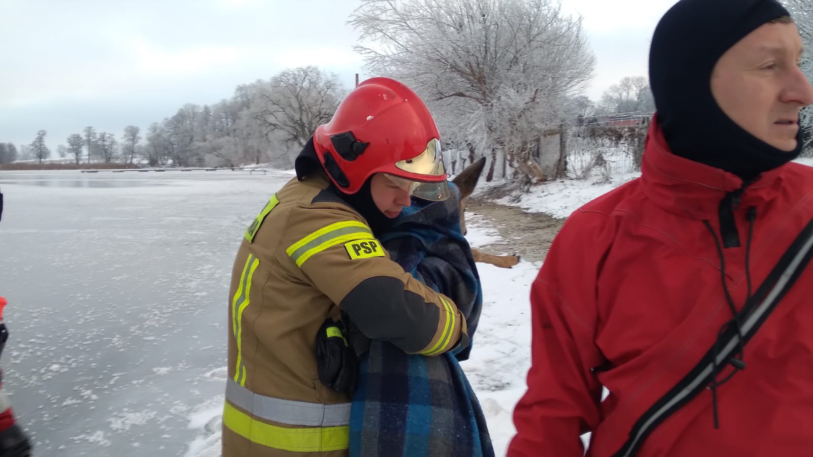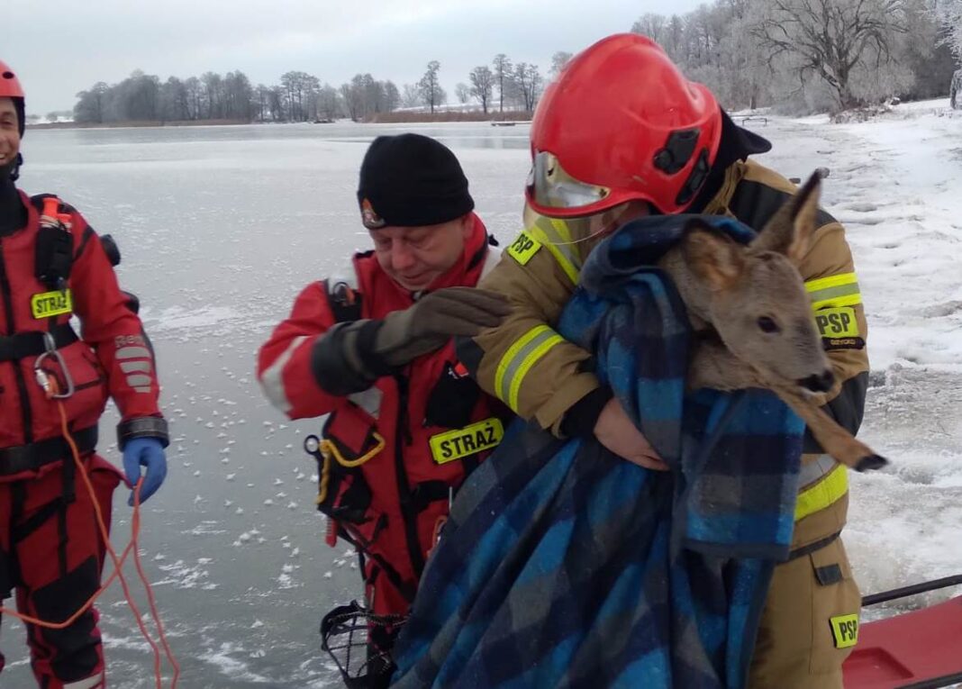 Niecodzienna akcja ratunkowa strażaków z Giżycka. Pomocy potrzebowała sarna, która weszła na lód i nie mogła samodzielnie się wydostać.