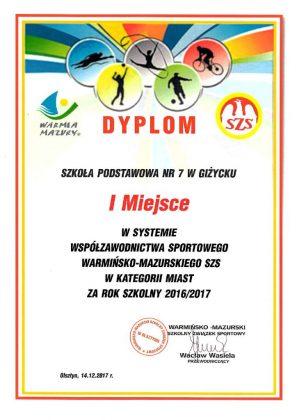 Podczas uroczystości dokonano podsumowania współzawodnictwa szkół i placówek oświatowych w różnych dyscyplinach sportowych w roku szkolnym 2016/2017, nagradzając najlepszych w każdej kategorii pucharami i dyplomami. W tym roku rywalizacja zakończyła się sukcesem uczniów ze Szkoły Podstawowej nr 7 z Giżycka. Zajęliśmy 1. miejsce w województwie. To wynik ciężkiej pracy i dobrego przygotowania sportowców i udział w wielu zawodach. Sukces ten zawdzięczamy uczniom oraz wszystkim nauczycielom wychowania fizycznego, a w szczególności p. Elżbiecie Krajewskiej i p. Wojciechowi Żukowskiemu, którzy w minionym roku szkolnym prowadzili grupy startowe.