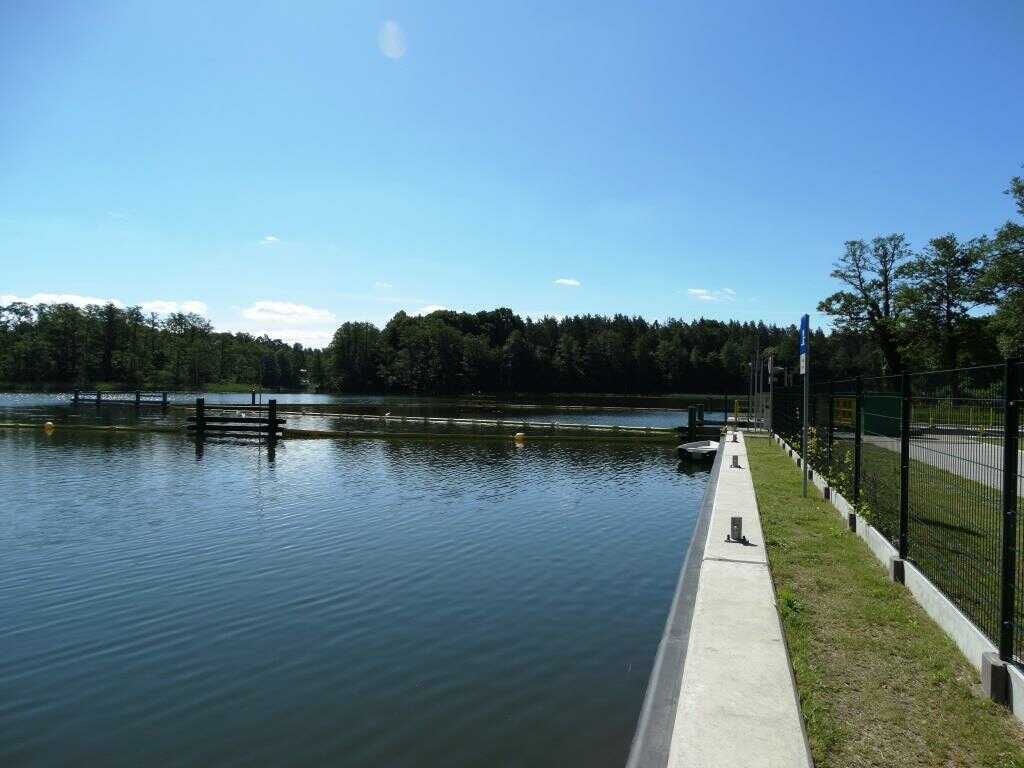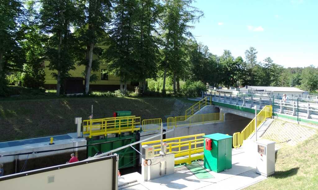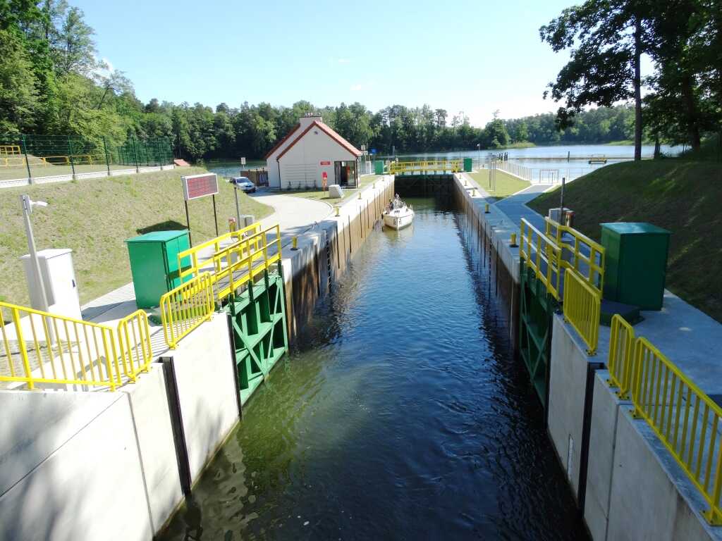 Śluza Guzianka II w Rucianem-Nidzie, łączy jeziora Guzianka Mała i Bełdany. Obiekt usprawnia ruch na szlaku żeglugowym Wielkich Jezior Mazurskich.