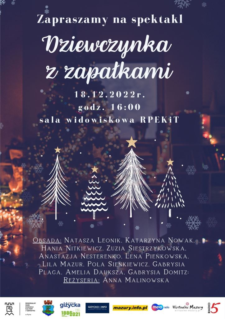 Spektakl „Dziewczynka z zapałkami” (zapowiedź) 14 grudnia 20220Regionalny Park Edukacji Kultury i Turystyki w Rynie zaprasza serdecznie na spektakl teatralny „Dziewczynka z zapałkami” w wykonaniu młodych aktorów grupy teatralnej działającej przy RPEKiT, w reżyserii Pani Anny Malinowskiej. Dziewczynka zapałkami – 2