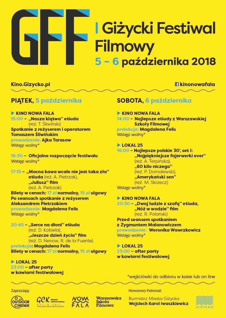 Kraina Wielkich Jezior Mazurskich przez dwa dni od 5-6 października będzie zachwycać nie tylko pięknym krajobrazem. Nieprzypadkowo to Giżycko stało się stolicą nowej inicjatywy na filmowej mapie Polski. To tutaj powstał kultowy „Nóż w wodzie” Romana Polańskiego, a w pobliskich Wilkasach Krzysztof Kieślowski zdobył uprawnienia żeglarskie. Aby móc wypłynąć na szerokie filmowe wody, trzeba uruchomić odwagę i zadebiutować. Kino Nowa Fala stanie się miejscem oglądania najciekawszych etiud i debiutów filmowych, a także przestrzenią dla interesujących rozmów o kinie.