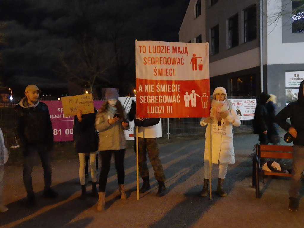 Zgromadzeni przynieśli ze sobą transparenty oraz skandowali hasła m.in. „wolność, własność, sprawiedliwość”, „stop segregacji sanitarnej”.