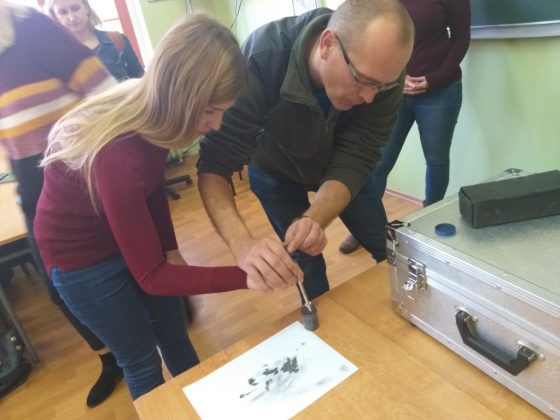Studenci mieli możliwość szczegółowo poznać pracę technika kryminalistyki w Policji. Na koniec spotkania były pytania i praktyczne zadania z daktyloskopii.