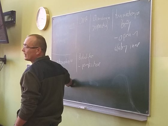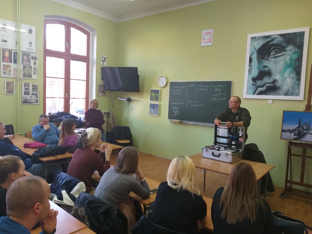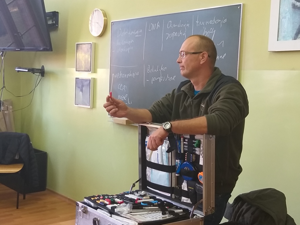 Spotkanie odbyło się w minioną sobotę, 30 listopada. Funkcjonariusz opowiadał o swojej służbie, o tym jak został technikiem kryminalistyki oraz przedstawił zadania jakie policjant wykonuje na tym stanowisku. Szczegółowo opowiadał o ujawnianiu i zabezpieczeniu śladów w takiej formie, aby mogły posłużyć do dalszych badań. Pomocna w prezentacji była „walizka”, która jest wyposażona we wszystko, co przydatne jest podczas oględzin miejsca zdarzenia – proszki daktyloskopijne, pędzelki z puchu marabuta, magnetyczne z różnego rodzaju włosia oraz włókien, służące do opylania miejsc, gdzie ujawniane są ślady, folie daktyloskopijne jak również pałeczki do wymazów. Na wyposażeniu walizki nie zabrakło przyrządów mierniczych, skalówek i numerków śladowych.
