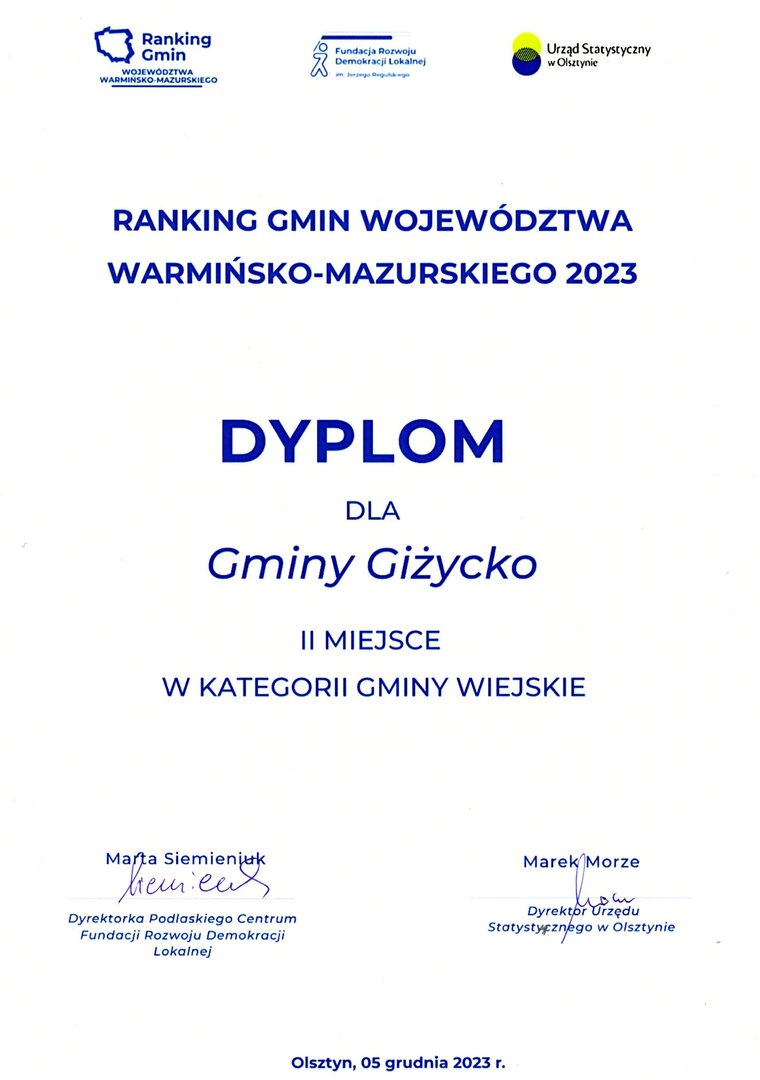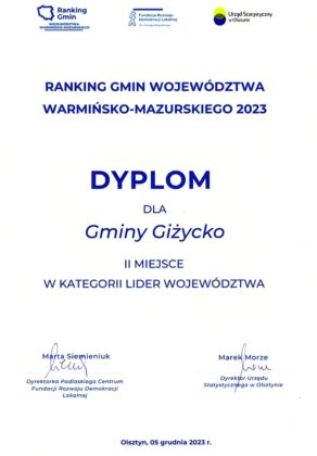 Gmina Giżycko stanęła na podium prestiżowego Ranking Gmin Województwa Warmińsko – Mazurskiego 2023. Samorząd uplasował się na drugim miejscu wśród wszystkich 116 gmin regionu w kategorii „Lider województwa”, pierwszym miejscu w powiecie giżyckim w kategorii „Lider Powiatowy” oraz drugim miejscu w kategorii „Gmin Wiejskich” województwa warmińsko-mazurskiego.
