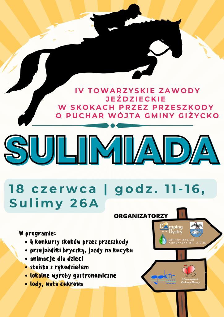 Licznych miłośników koni informujemy, że trwają przygotowania do IV edycji Towarzyskich Zawodów Jeździeckich w Skokach przez Przeszkody o Puchar Wójta Gminy Giżycko pod nazwą Sulimiada 2023!