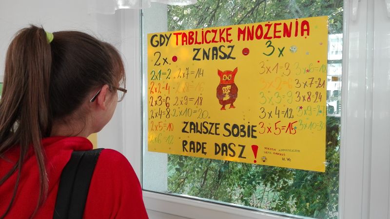 Zgodnie z hasłem tegorocznej akcji „Młodzi sprawdzają czy starsi tabliczkę mnożenia znają” –patrole z klas VI egzaminowały dorosłych w szkole: nauczycieli, rodziców, pracowników szkoły. Chętne osoby podjęły wyzwanie, mogły wybierać również trudniejsze przykłady.