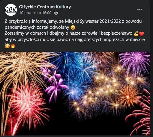 „Z przykrością informujemy, że Miejski Sylwester 2021/2022 z powodu pandemicznych został odwołany. Zostańmy w domach i dbajmy o nasze zdrowie i bezpieczeństwo aby w przyszłości móc się bawić na najgorętszych imprezach w mieście”