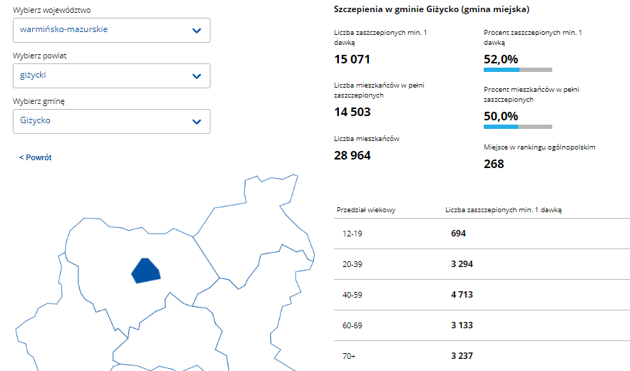 Z najnowszych danych, opublikowanych na stronie ministerstwa zdrowia wynika, że dotychczas w powiecie giżyckim, przeciwko COVID-19 zaszczepiło się ogółem 27091 mieszkańców. Największy procent w pełni zaszczepionych osób jest w Giżycku i wynosi 50 %.