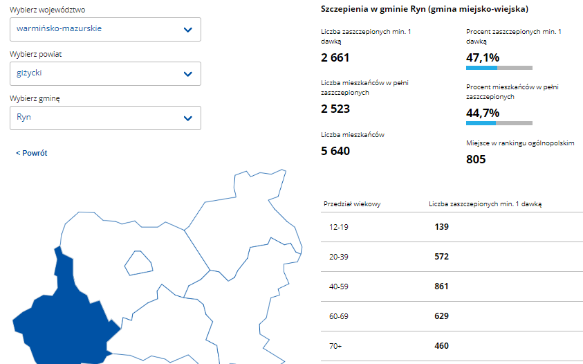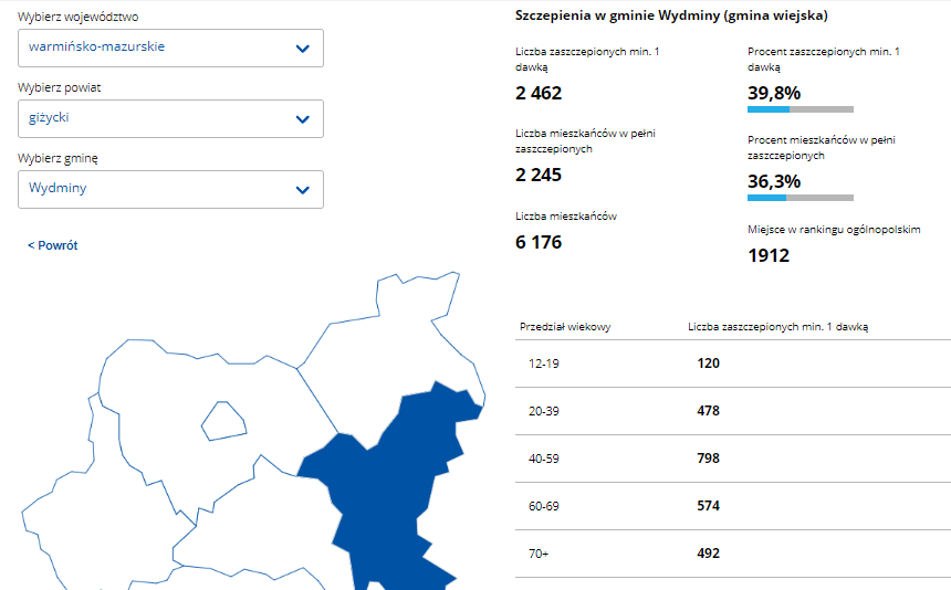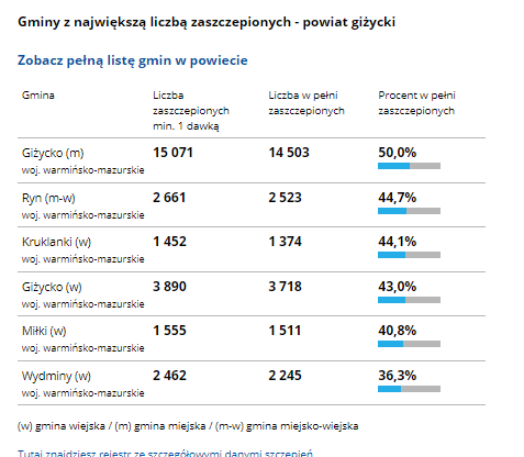 Poniżej prezentujemy poziom zaszczepienia w poszczególnych gminach powiatu giżyckiego.