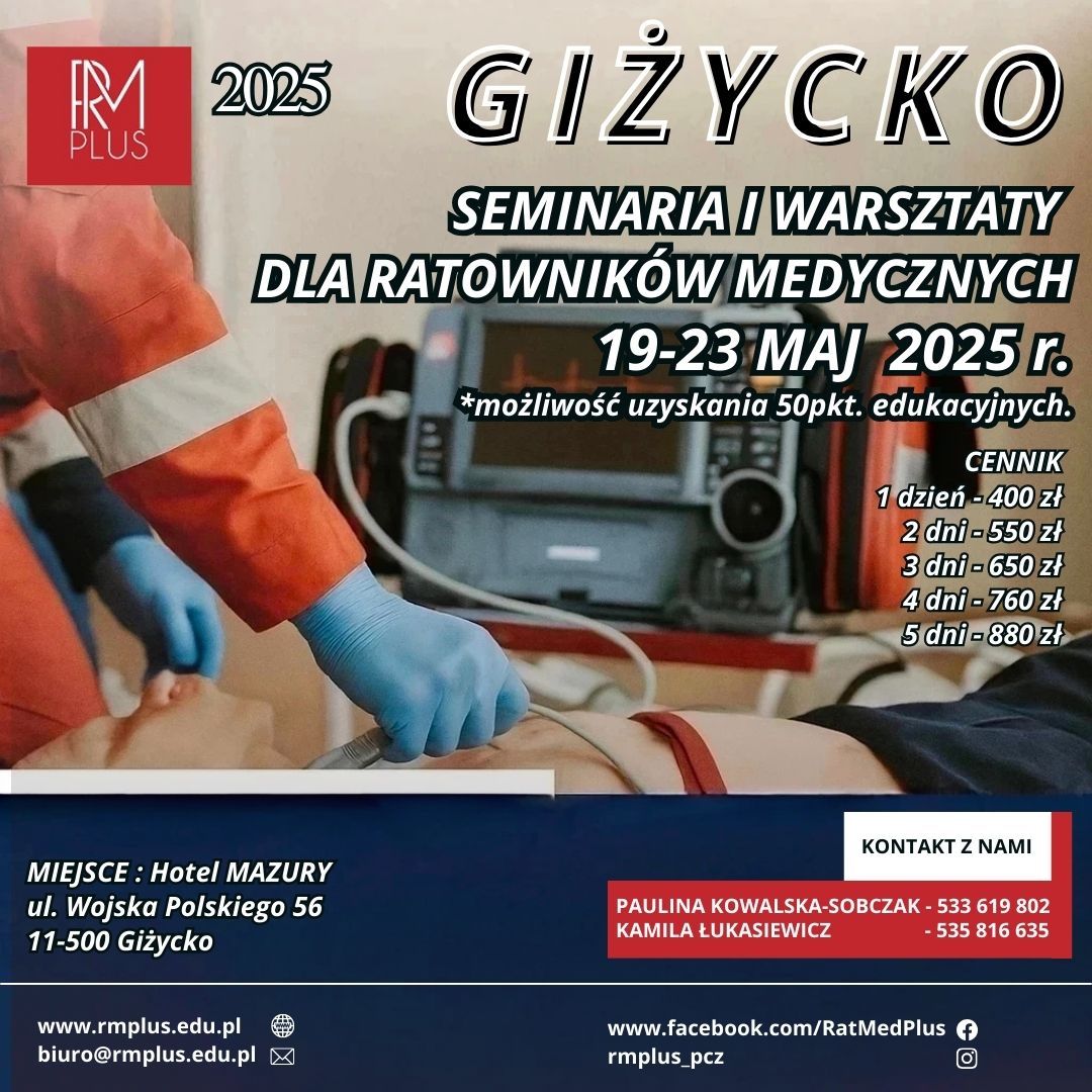 Z ogromną przyjemnością zapraszamy ratowników medycznych z całej Polski do udziału w seminariach i warsztatach organizowanych przez RM PLUS, które odbędą się w dniach 19–23 maja 2025 roku w malowniczym Giżycku, w Hotelu Mazury!