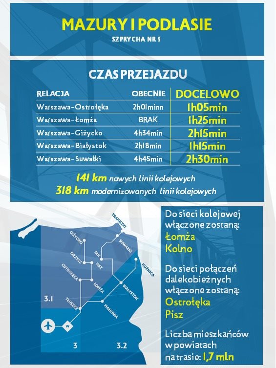 Dzięki inwestycjom spółek CPK i PKP Polskie Line Kolejowe, które zostały przewidziane w ramach szprychy nr 3, do sieci połączeń dalekobieżnych zostaną włączone Łomża i Kolno. Korzyści dla mieszkańców są oczywiste. Podróż z Ostrołęki do Warszawy skróci się niemal dwukrotnie (i wyniesie 1 godz. 5 minut) , z Suwałk do Warszawy dojedziemy w czasie o ponad 2 godz. krótszym niż obecnie (w 2 godz. 30 min.), a z Białegostoku do stolicy przyjedziemy godzinę wcześniej niż obecnie (podróż zajmie 1 godz. 15 min.).