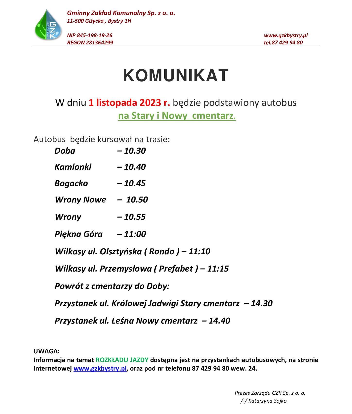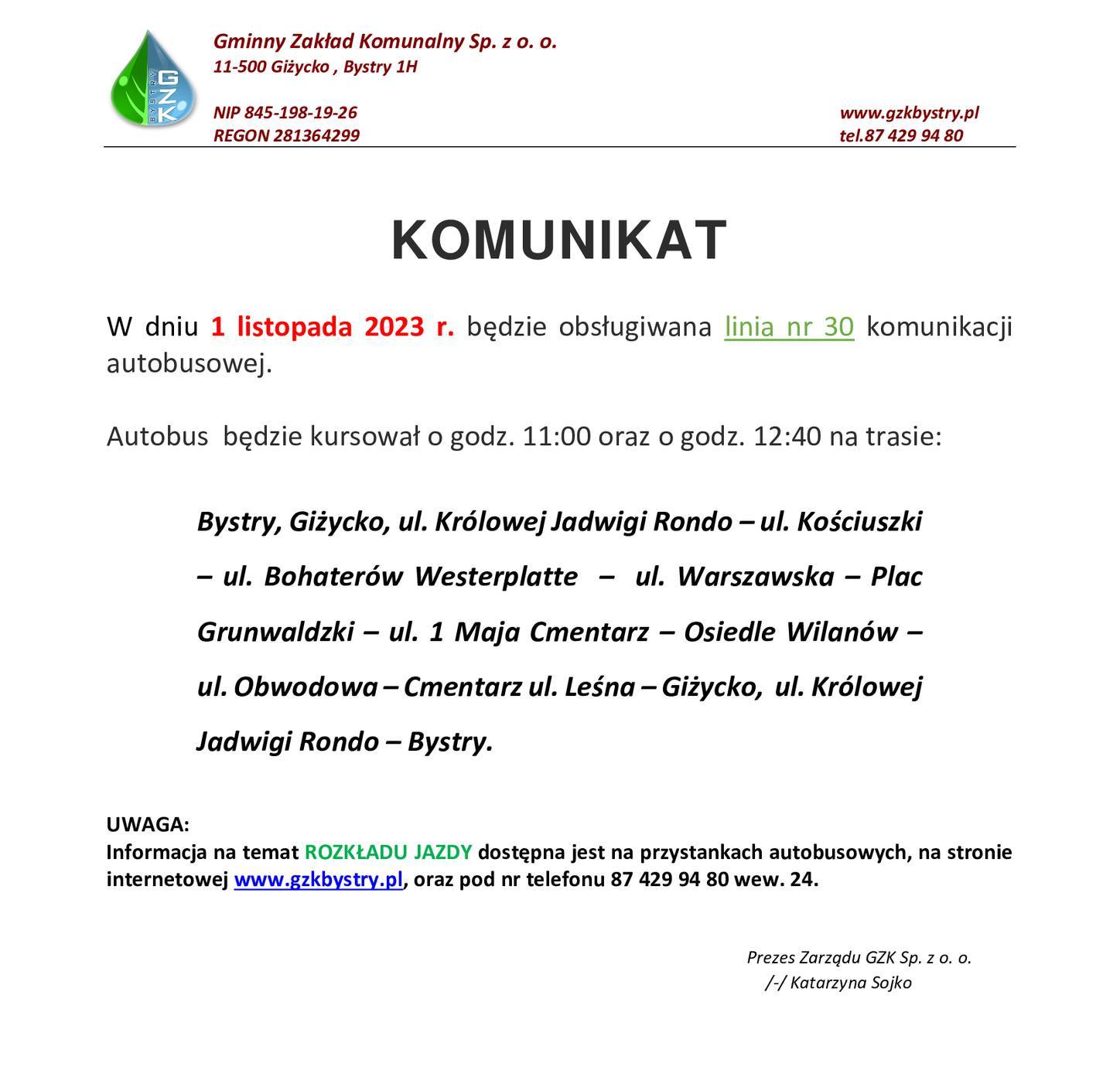 Gminny Zakład Komunalny informuje, że 1 listopada 2023 r. zostanie podstawiony autobus na Stary i Nowy cmentarz oraz będzie obsługiwana linia nr 30 komunikacji autobusowej.