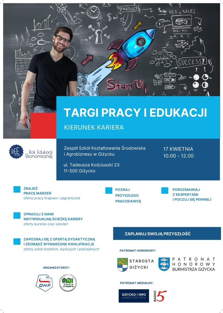 Młodzieżowe Centrum Kariery OHP w Giżycku wraz z Zespołem Szkół Kształtowania Środowiska i Agrobiznesu w Giżycku serdecznie zapraszają na Targi Pracy i Edukacji pod hasłem przewodnim „Kierunek Kariera”, które odbędą się 17 kwietnia w godz. 10:00-12:00 w Zespole Szkół Kształtowania Środowiska i Agrobiznesu przy ul. Tadeusza Kościuszki 23.