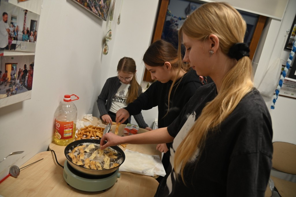 Świetlicę we Wronce wzięły we władanie dzieciaki, które przyjechały tam z różnych miejscowości w gminie. Pod wodzą jak zawsze niezawodnych kobiet z KGW Wronka lepiły pączki smażąc je i wypełniając później nadzieniem z czekolady i marmolady. Bardzo szybko przygotowywały do wypieku również chrusty obserwując jak w patelniach szybko zmieniają kolor na złotobrązowy.