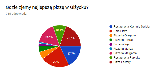 W serwisie Gizycko.info zamieściliśmy sondę w której głosowanie trwało do 22 maja do godziny 22.00. Okazało się, że najwięcej głosów oddaliście na pizzerię Halo Pizza! Pozostaje nam tylko ogłosić, że w Halo Pizza dostaniemy „Najlepszą Pizzę w Giżycku 2017”!!!