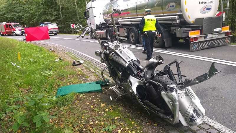 Pracujący na miejscu policjanci wstępnie ustalili, że motocyklista na łuku drogi w lewo stracił panowanie nad jednośladem i uderzył w nadjeżdżającą z naprzeciwka cysternę.