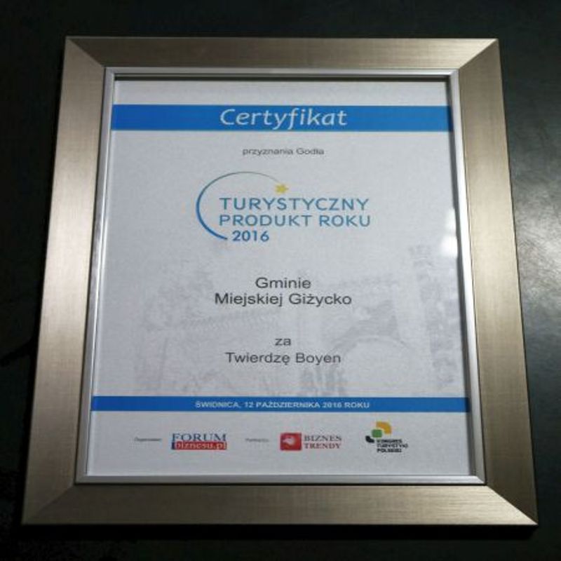 12 października 2016 roku odbyła się w Świdnicy uroczysta Gala. Wręczono nagrody branżowe, dedykowane organizatorom, usługodawcom i producentom bardzo aktywnym w branży turystycznej. Wśród tegorocznych laureatów Programu Turystyczny Produkt / Turystyczna Usługa Roku 2016 znalazłam się giżycka Twierdza Boyen. Nagrodę odebrał burmistrz Wojciech Iwaszkiewicz.