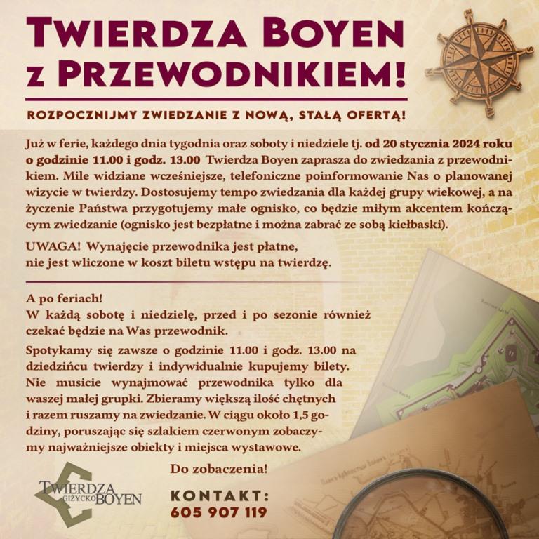 Już w ferie, każdego dnia tygodnia oraz soboty i niedziele tj. od 20 stycznia 2024 roku o godzinie 11.00 Twierdza Boyen zaprasza do zwiedzania z przewodnikiem.
