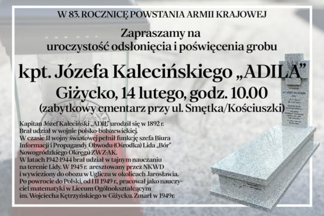 W 83. rocznicę powstania Armii Krajowej odbędzie się uroczystość odsłonięcia i poświęcenia grobu kpt. Józefa Kalecińskiego „Adila”. Na wydarzenie zaprasza Instytut Pamięci Narodowej.