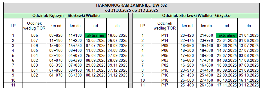 STRABAG Sp. z o.o. Wykonawca na zadaniu „„Rozbudowa drogi wojewódzkiej nr 592 na odcinku Kętrzyn – Giżycko” informuje o zmianie w występowaniu utrudnień w ruchu od 22.04.2025. zostaną całkowicie wyłączone z ruchu odcinki drogi wojewódzkiej numer 592 od km 8+820 do km 11+180 oraz od km 22+475 do km 23+970.