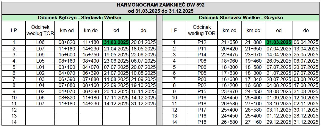 STRABAG Sp. z o.o. Wykonawca na zadaniu „„Rozbudowa drogi wojewódzkiej nr 592 na odcinku Kętrzyn – Giżycko” informuje o występowaniu utrudnień w ruchu od dn. 10.03.2025 na podstawie zatwierdzenia projektu tymczasowej organizacji ruchu o numerze: IG-BD.8022.2.51.2025 przez Marszałka Województwa Warmińsko-Mazurskiego: