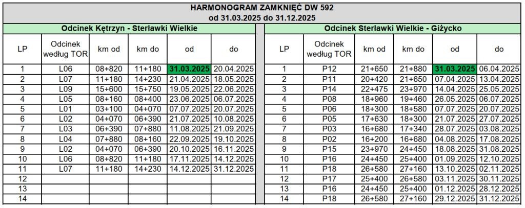 STRABAG Sp. z o.o. Wykonawca na zadaniu „„Rozbudowa drogi wojewódzkiej nr 592 na odcinku Kętrzyn – Giżycko” informuje o występowaniu utrudnień w ruchu od dn. 31.03.2025 na podstawie zatwierdzenia projektu tymczasowej organizacji ruchu o numerze: IG-BD.8022.2.51.2025 przez Marszałka Województwa Warmińsko-Mazurskiego: