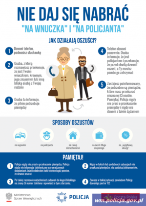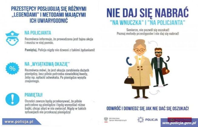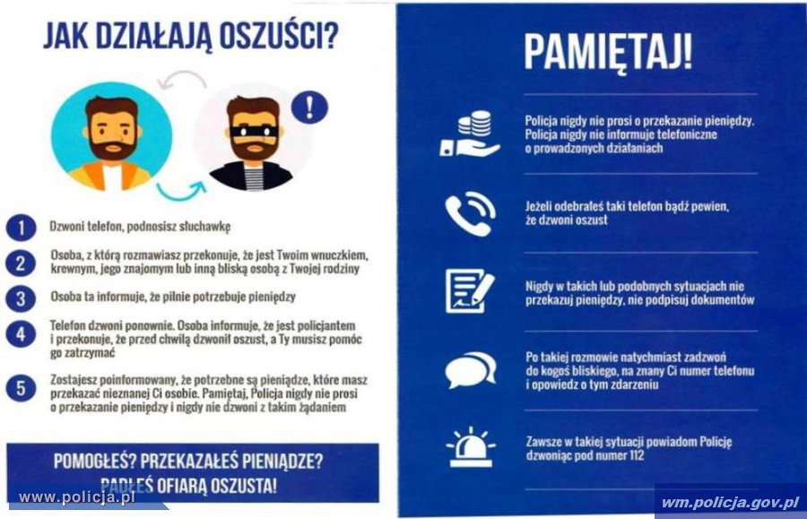 Przed nami majówka, czas spotkań rodzinnych. Policjanci apelują, szczególnie do rodzin i bliskich starszych osób, aby podczas wizyty, odwiedzin dziadków uczulać ich na takie bądź podobne sytuacje. Zawsze kiedy nieznajomi proszą o pieniądze należy skontaktować się z członkiem rodziny. Pamiętajmy również o tym, że Policja nigdy telefonicznie nie informuje o swoich działaniach i nigdy nie prosi o przekazanie jakichkolwiek pieniędzy.