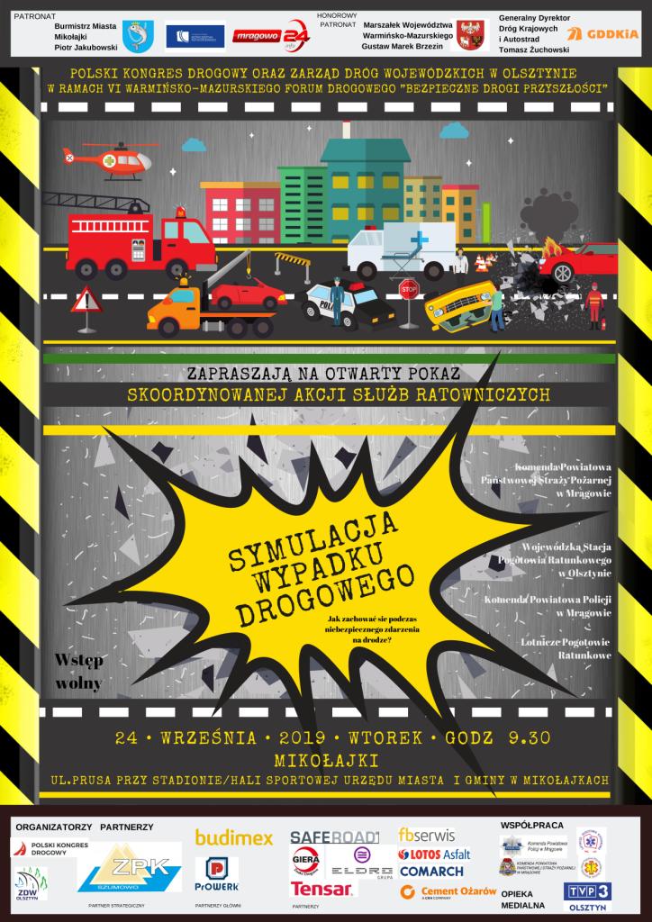 Ważnym punktem programu Naszego wydarzenia będzie pokaz symulowanego wypadku drogowego – skoordynowanej akcji służb ratowniczych, który odbędzie się w dniu 24.09.2019 r. w godzinach 09.30 – 10.45 na ul. Wawrzyńca Prusa, na placu naprzeciwko Stadionu w Mikołajkach. Pokaz ten będzie skierowany nie tylko do uczestników konferencji ale również do społeczności lokalnej. Symulacja ma na celu pokazanie w jaki sposób przypadkowi świadkowie wypadku drogowego powinni udzielić pierwszej pomocy dla osób poszkodowanych oraz przybliżyć sposób działania służb ratowniczych, w tym: Zespołu Ratownictwa Medycznego, Zastępów Straży Pożarnej, Policji oraz śmigłowca Lotniczego Pogotowia Ratunkowego.