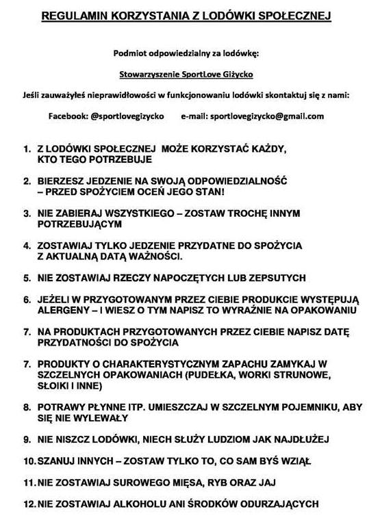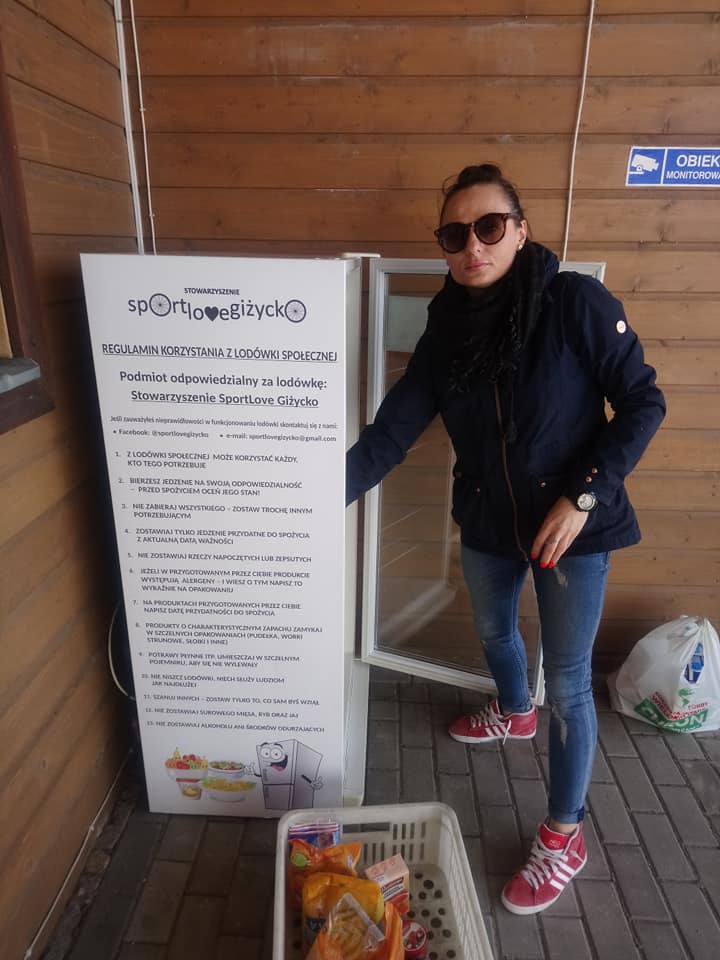 Z inicjatywą ustawienia lodówki wyszło stowarzyszenie Sportlovegiżycko. Lodówka jest czynna całą dobę. Każdy może do niej włożyć jedzenie przydatne do spożycia, z aktualną datą ważności.