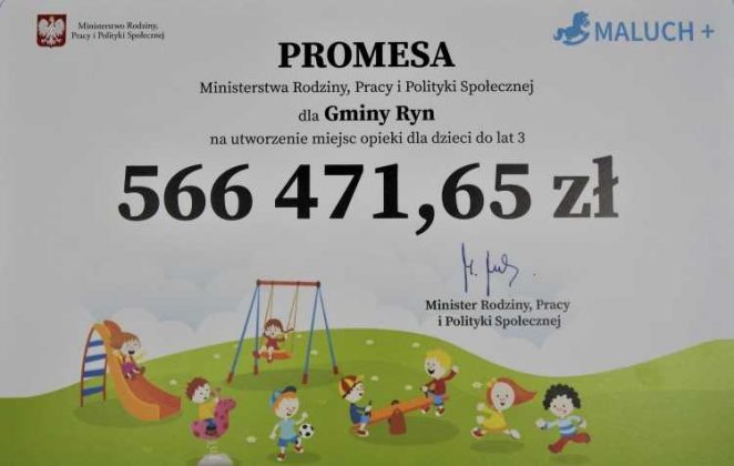 Wysokość dofinansowania z Ministerstwa Rodziny, Pracy i Polityki Społecznej wynosi 566 471,65 zł, wkład własny Gminy Ryn to 139 117,91 zł.
