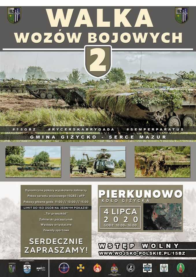 Walka Wozów Bojowych [ZAPOWIEDŹ] 1 lipca 2020015. Giżycka Brygada Zmechanizowana i Urząd Gminy Giżycko zapraszają na Walkę Wozów Bojowych w Pierkunowie. Wydarzenie odbędzie się 4 lipca (sobota), początek o godzinie 10.00. Program imprezy na plakacie poniżej.