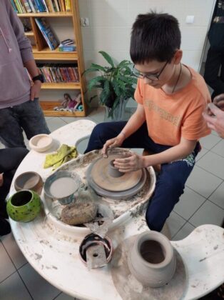 Pod fachowym okiem p. Olgi chłopcy wykonali naczynia z gliny na kole napędzanym nogą. Natomiast p. Marcin zaprezentował budowę i działanie bębnów, a potem wybijanie rytmu.