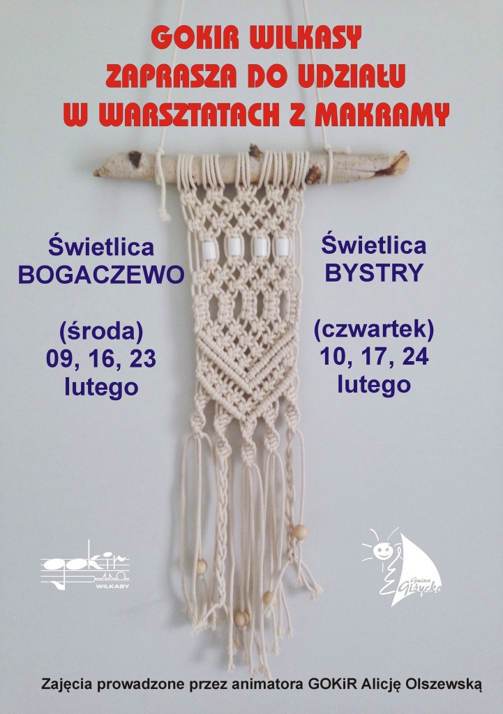 Gminny Ośrodek Kultury i Rekreacji w Wilkasach organizuje warsztaty makramy w świetlicach wiejskich w Bystrym i Bogaczewie.