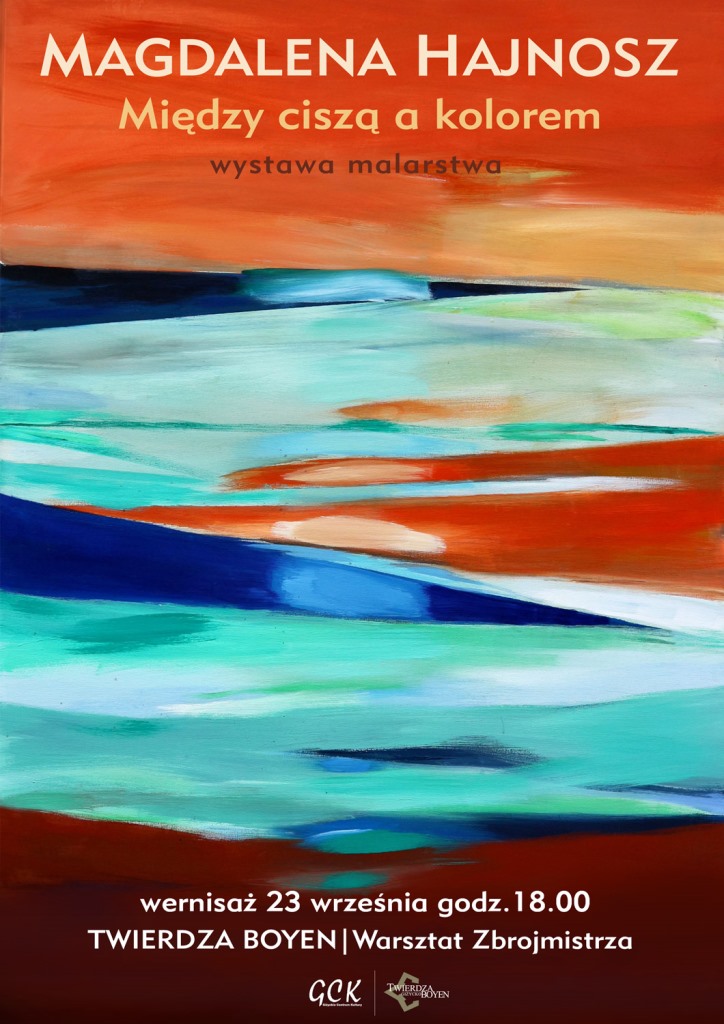 Gorąco zapraszamy w piątek 23 września na wernisaż wystawy malarstwa Magdaleny Hajnosz, zatytułowany „Między ciszą a kolorem”. Otwarcie wystawy odbędzie się o godzinie 18.00 w Warsztacie Zbrojmistrza na Twierdzy Boyen.