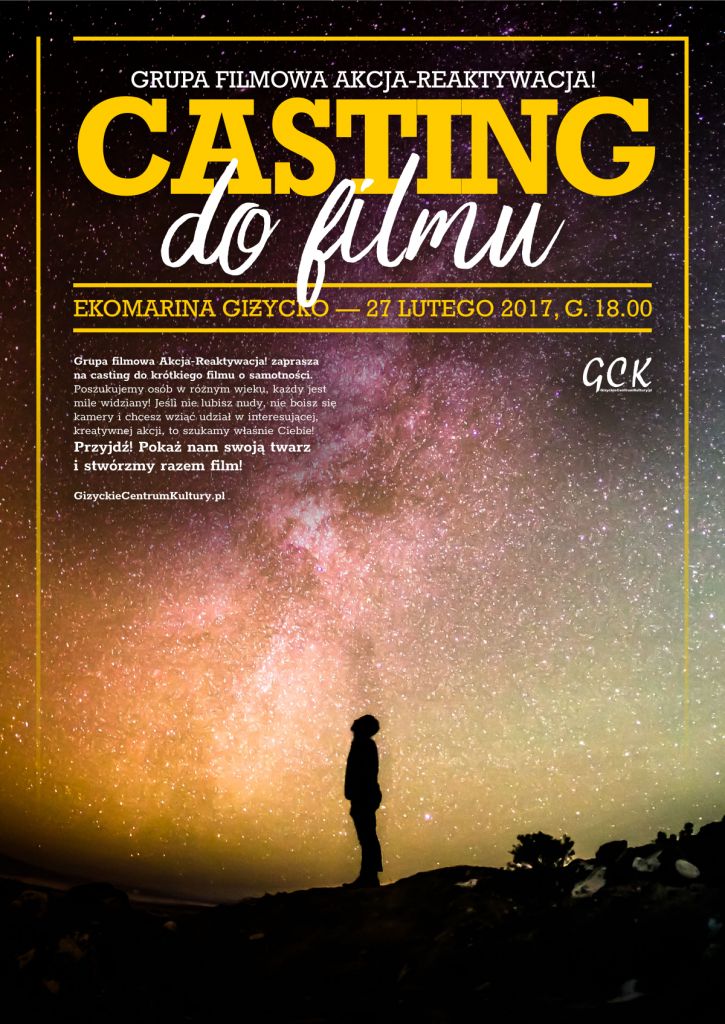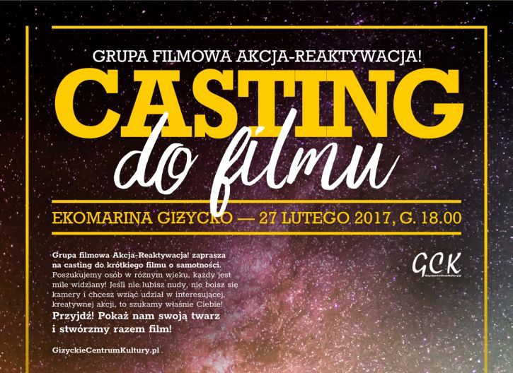 Grupa filmowa Akcja – REaktywacja! zaprasza na casting do krótkiego filmu o samotności. Poszukujemy osób w różnym wieku, każdy jest mile widziany! Jeśli nie lubisz nudy, nie boisz się kamery i chcesz wziąć udział w interesującej, kreatywnej akcji, to szukamy właśnie Ciebie! Przyjdź! Pokaż nam swoją twarz i stwórzmy razem film!