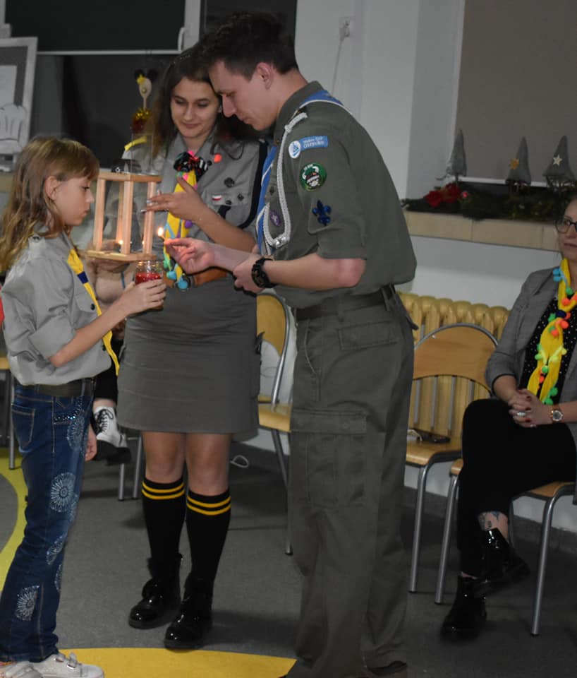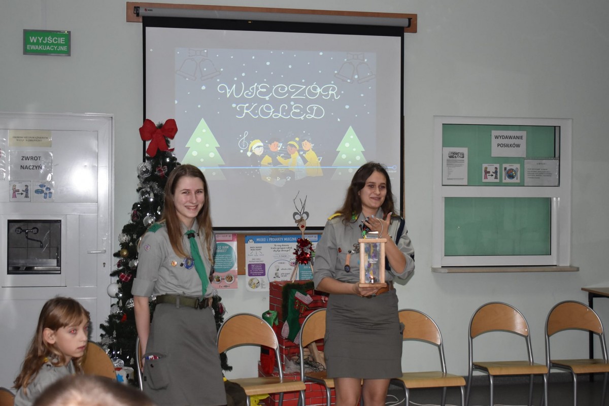 W tym roku w Wieczorze Kolęd uczestniczyli również harcerze z Hufca ZHP Giżycko, którzy przynieśli do szkoły Betlejemskie Światło Pokoju.