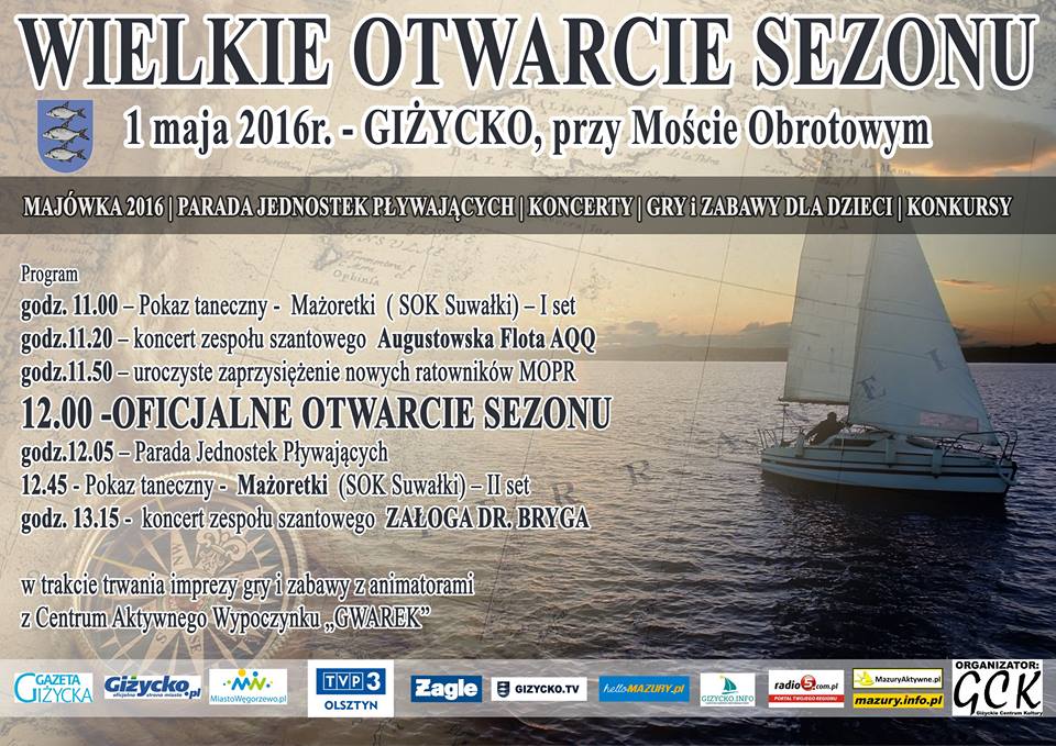 Wielkie Otwarcie Sezonu 2016 14 kwietnia 20160Wielkie Otwarcie Sezonu w Giżycku – 1 maja przy Moście Obrotowym. W programie koncerty, parada jednostek pływających, pokazy taneczne, gry i zabawy. Zapraszamy!