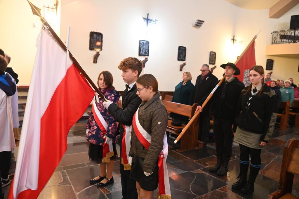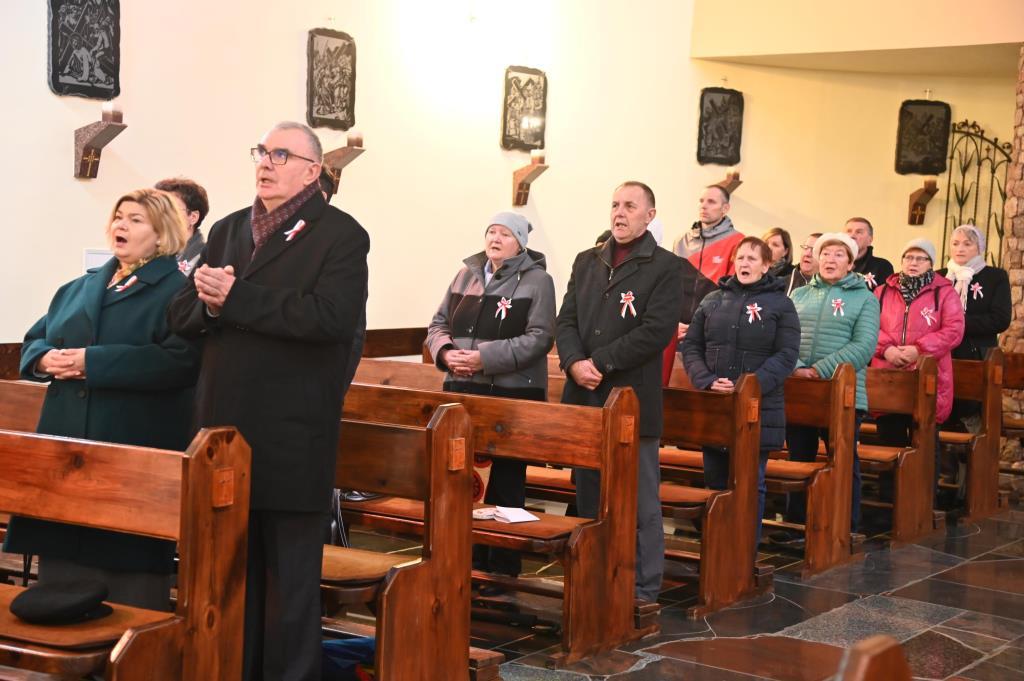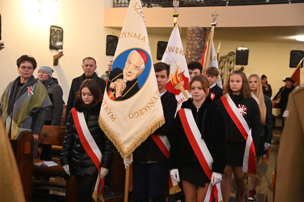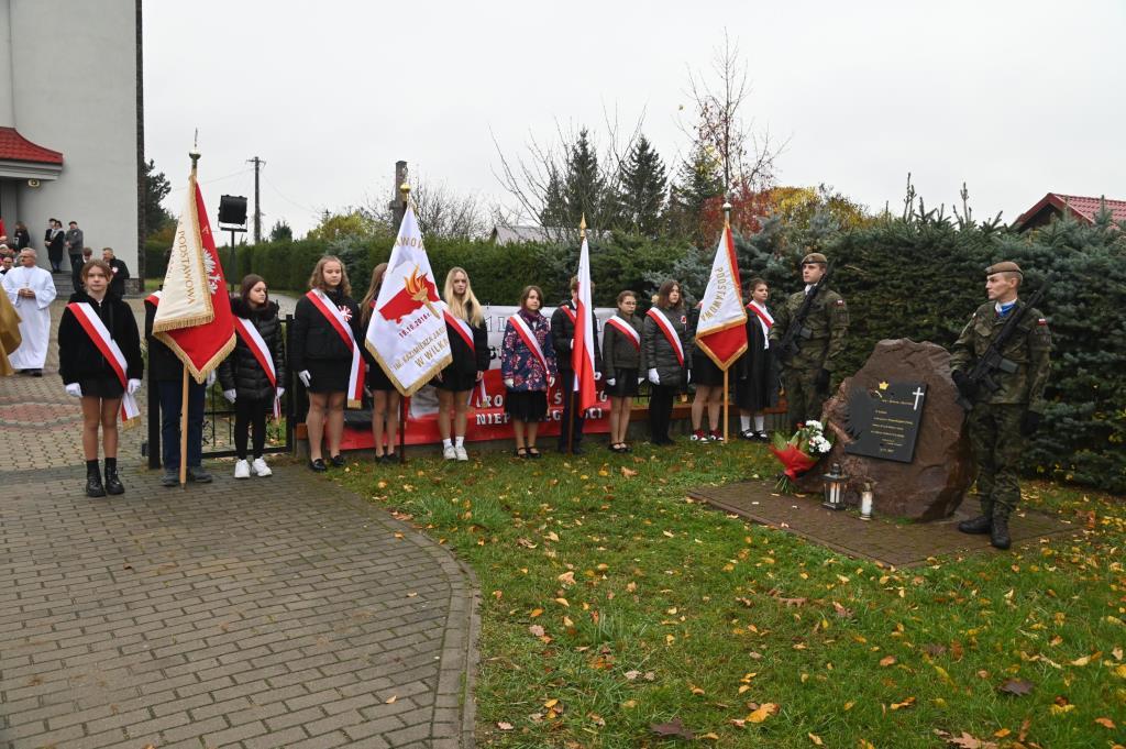 W sobotę z kolei w samo południe w kościele św. Jadwigi Królowej w Bystrym odbyła się uroczysta msza święta celebrowana przez proboszcza parafii księdza Mirosława Sorbaja z udziałem pocztów sztandarowych szkół podstawowych w Wilkasach, Upałtach, Bystrym oraz Spytkowie, a także druhów z Komendy Hufca ZHP. Każdy z wiernych otrzymał przed wejściem do świątyni pamiątkowy kotylion, który przyczepiał do odzieży. Po godzinie pod tablicą ku czci walczącym o wolność Polski stanęła asysta honorowa żołnierzy 41 Giżyckiego Batalionu Lekkiej Piechoty Wojsk Obrony Terytorialnej i pięć wymienionych pocztów, a delegacje samorządu, radnych, nauczycieli, księży i mieszkańców złożyły wiązanki kwiatów stawiając także zapalone znicze. Wójt Marek Jasudowicz i radni wiązankę złożyli również pod pamiątkową tablicą na ścianie świątyni w Wilkasach.