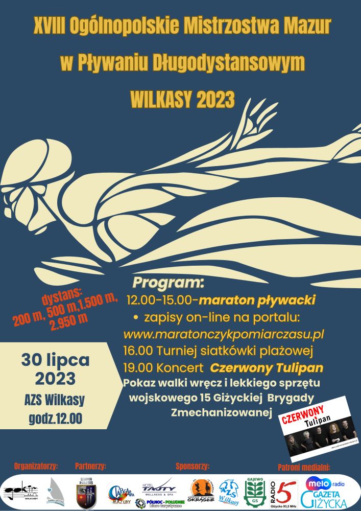 Już wkrótce, 30 lipca 2023, w Wilkasach przy ul. Niegocińskiej 5, nieopodal kąpieliska ośrodka AZS COSA nad jeziorem Niegocin odbędą się XVIII Ogólnopolskie Mistrzostwa Mazur w Pływaniu Długodystansowym. Tradycyjnie ich organizatorami są Gmina Giżycko oraz Gminny Ośrodek Kultury i Rekreacji w Wilkasach, start o godz. 12.00 na dystansach 200 m, 500 m, 1.500 m oraz 2.950 m.