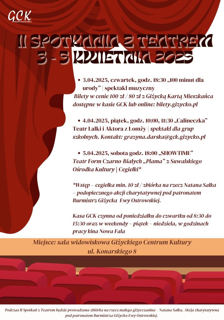 Giżycko ponownie stanie się centrum teatralnych emocji! W dniach 3–5 kwietnia w Giżyckim Centrum Kultury odbędzie się druga edycja Spotkań z Teatrem – wydarzenia, które łączy pokolenia i otwiera przed widzami drzwi do fascynującego świata sztuki scenicznej.
