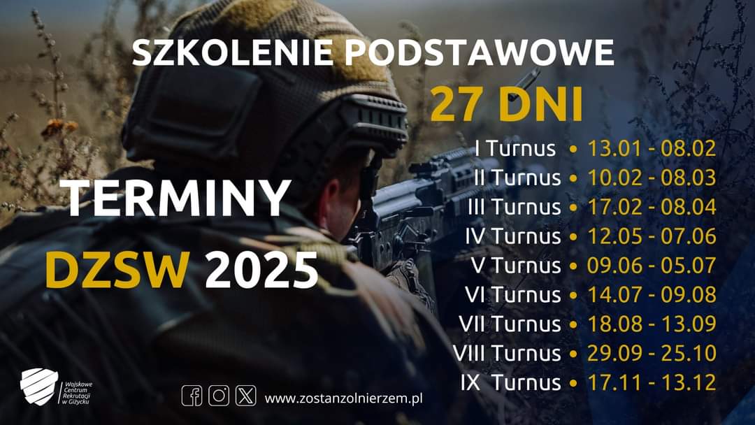 W 2025 roku pierwszy turnus szkolenia podstawowego dobrowolnej zasadniczej służby wojskowej ruszy 13 stycznia i potrwa do 8 lutego. Takich szkoleń w przyszłym roku będzie jeszcze dziesięć, w tym dwa dla absolwentów klas wojskowych, którzy biorą udział w edukacyjnych programach Ministerstwa Obrony Narodowej.